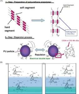 نیازهای روزافزون برای محافظت از محیط زیست و سلامت مردم منجر به تولید فرمولاسیون های جدید با محیط پیوسته ی  آبی شده است که به عنوان چسب ، پوشش درزگیر برای صنایع خودرو سازی ، ساخت و تولید کفش ، غلیظ کننده ها، خمیرهای رنگدانه ای و رنگهای نساجی … مورد استفاده قرار می گیرد.  پرکاربردترین مسیر سنتز پلی یورتان های پراکنش در آب اصلاح ساختاری است ، یعنی زنجیره اصلی پلی یورتان آبگریز با گروه های آبدوست اصلاح شده و سپس آب دیونیزه به امولسیون افزوده می شود و پیش پلیمر یورتانی آب دوست ، با زنجیره افزاینده تولید می شود.